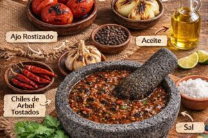 El secreto de esta salsa está en el “tatemado”, que consiste en asar los ingredientes hasta que la piel se queme ligeramente, aportando ese sabor ahumado tan especial.