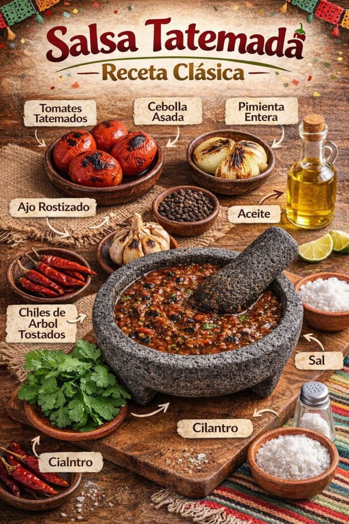 Esta es la receta para preparar una auténtica Salsa Tatemada Clásica, siguiendo los ingredientes y el estilo tradicional que muestra la imagen.